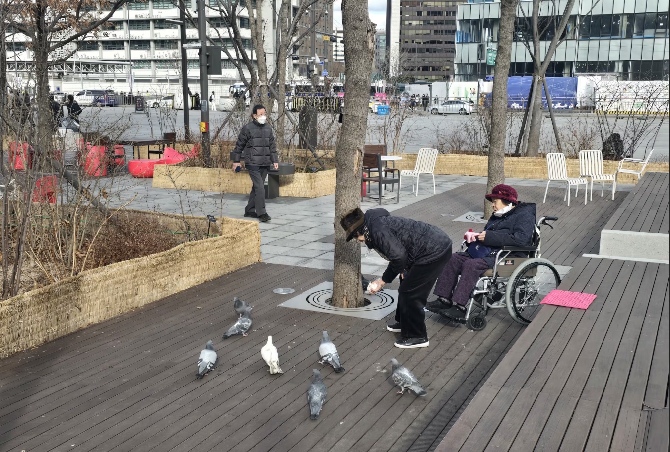 서울 종로구 종묘 앞에서 비둘기에게 피자빵을 뿌리던 한 어르신은
