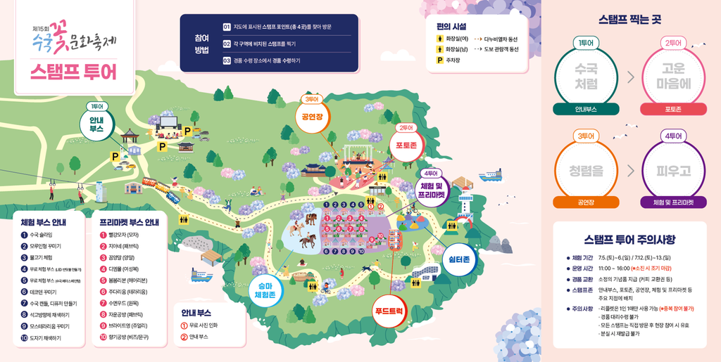 - 주요 사항: 아름다운 수국 군락지는 축제 기간 내내 자유롭게 감상하실 수 있습니다. 다만, 아래에 소개해 드릴 공연, 체험, 플리마켓 등의 특별 프로그램은 주말인 토요일과 일요일(7/5, 7/6, 7/12, 7/13, 총 4일간)에만 운영되오니, 방문 계획에 반드시 참고하시기 바랍니다.