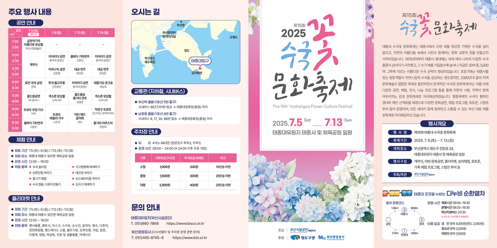 제15회 태종대 수국꽃 문화축제는 바쁜 일상에 지친 모든 분들에게 자연이 주는 위로와 문화적 즐거움을 동시에 선사하는 소중한 시간이 될 것입니다. 탐스럽게 피어난 수국의 향연 속에서 행복한 에너지를 가득 충전하시고, 잊지 못할 여름의 추억을 만들어 가시길 진심으로 바랍니다.